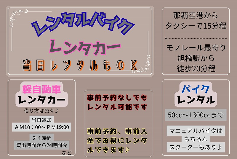 レンタカー・レンタルバイク共に当日レンタルも可能です(^^♪